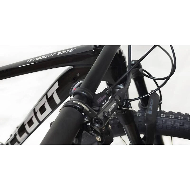 L’evolution 9.1 avec cadre en carbone Boost est équipé d’une suspension avant Rockshox Judy air, d’un groupe complet Shimano Deore 12V avec des roues et des freins également en Shimano Deore.